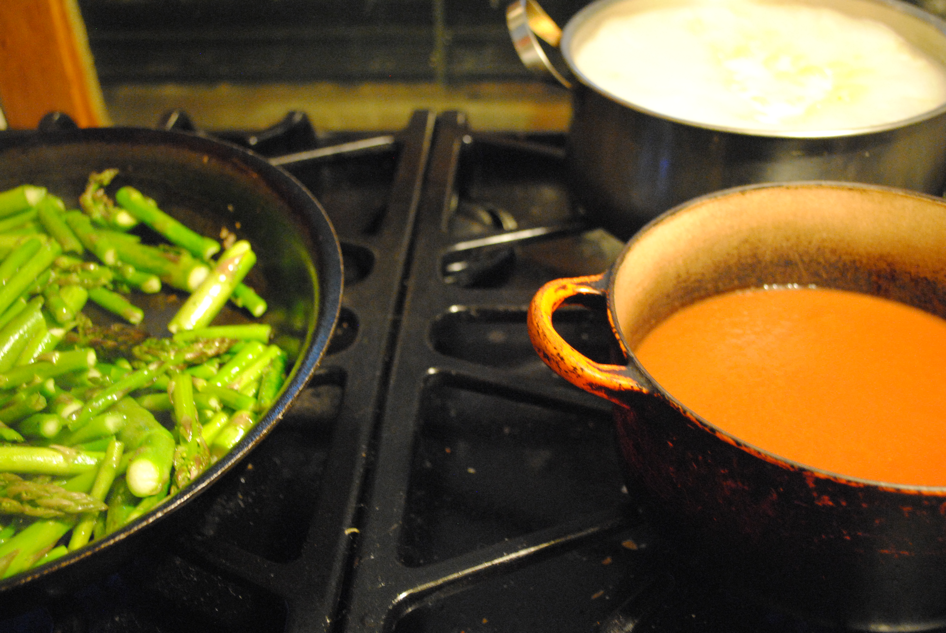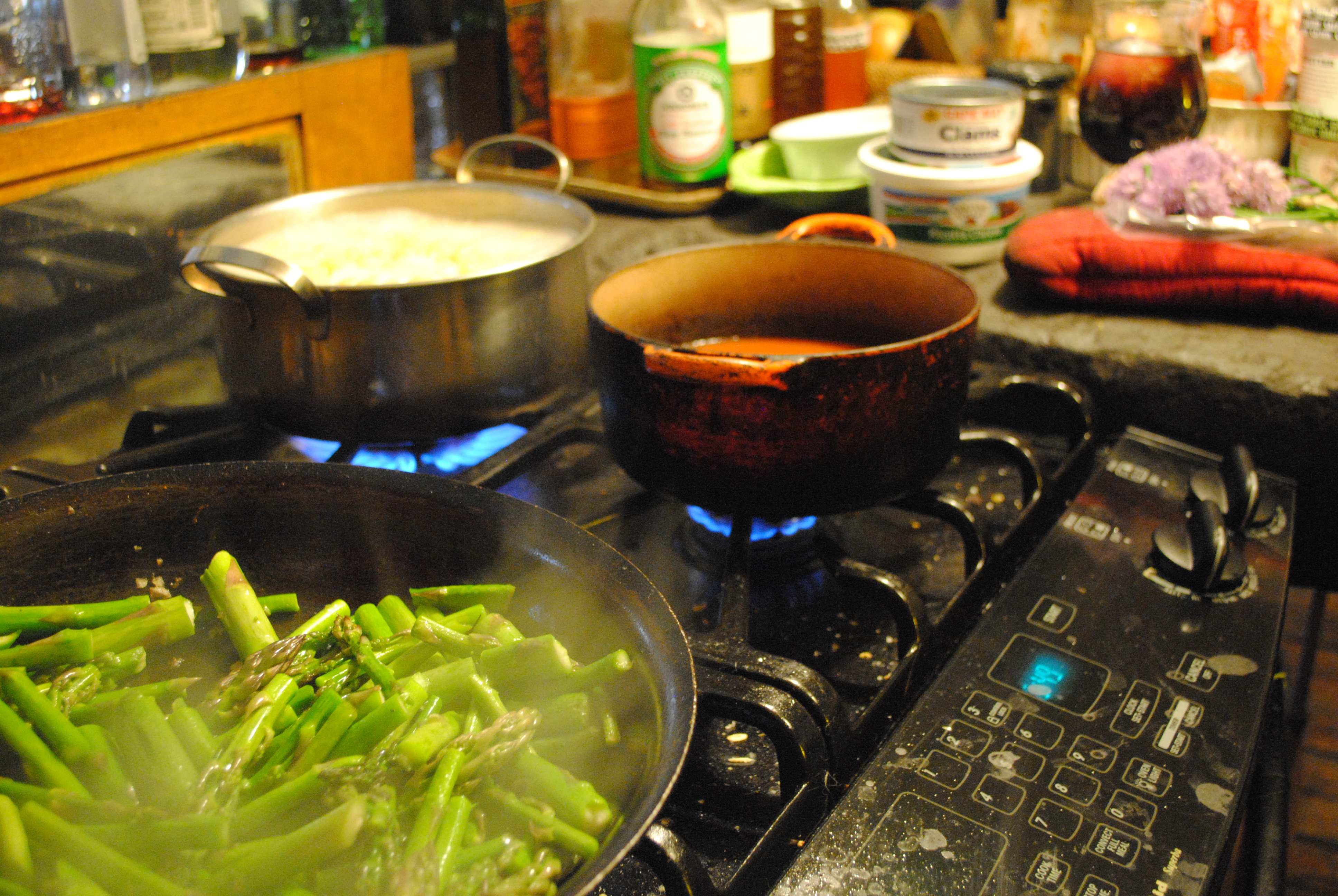 For dinners, we whipped up a few of our favorite asparagus classics. Risottos, curries, and pasta dishes. Our garden is producing a lovely harvest of chives. I love nothing more than garnishing an asparagus dish with fried flowers. Tasty and beautiful. Still want to make dumplings or ravioli but this week was a bit too crazy for any project cooking or elaborate meals. Quick and dirty faves that are fun to cook, simple to throw together, and highlight the fresh delicious asparagus harvest!