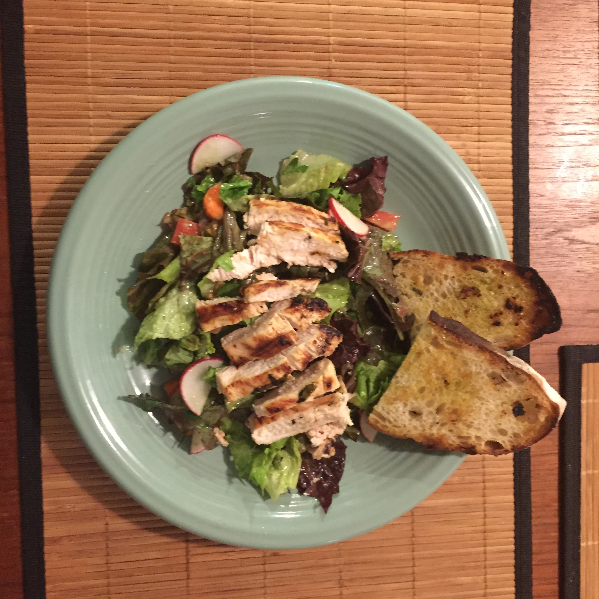 After picking up our share on Monday, I decided to make a giant salad using a lot of those salad greens since those tend to perish more quickly than some of the sturdier greens we got. This was basically the greens, radishes from the share, and some grilled chicken (plus some grilled garlic bread). Yummy and simple summer meal!