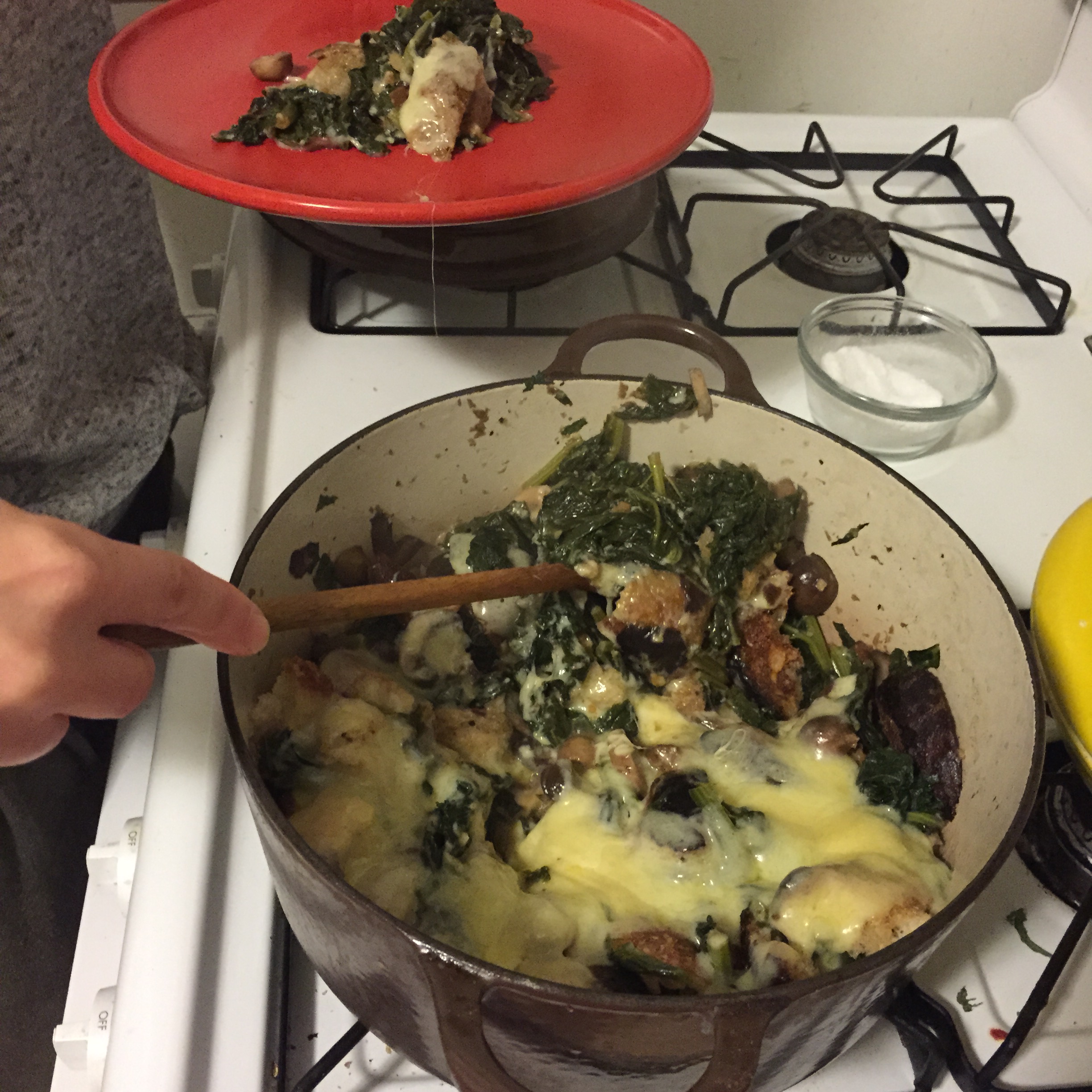 On Thursday night we made this recipe from Smitten Kitchen. We used the spinach and some kale, sautéed with mushrooms, nestled with some toasted bread, and broiled with some melted cheese on top. It doesn’t look that pretty but it was super tasty and a really quick weeknight meal.