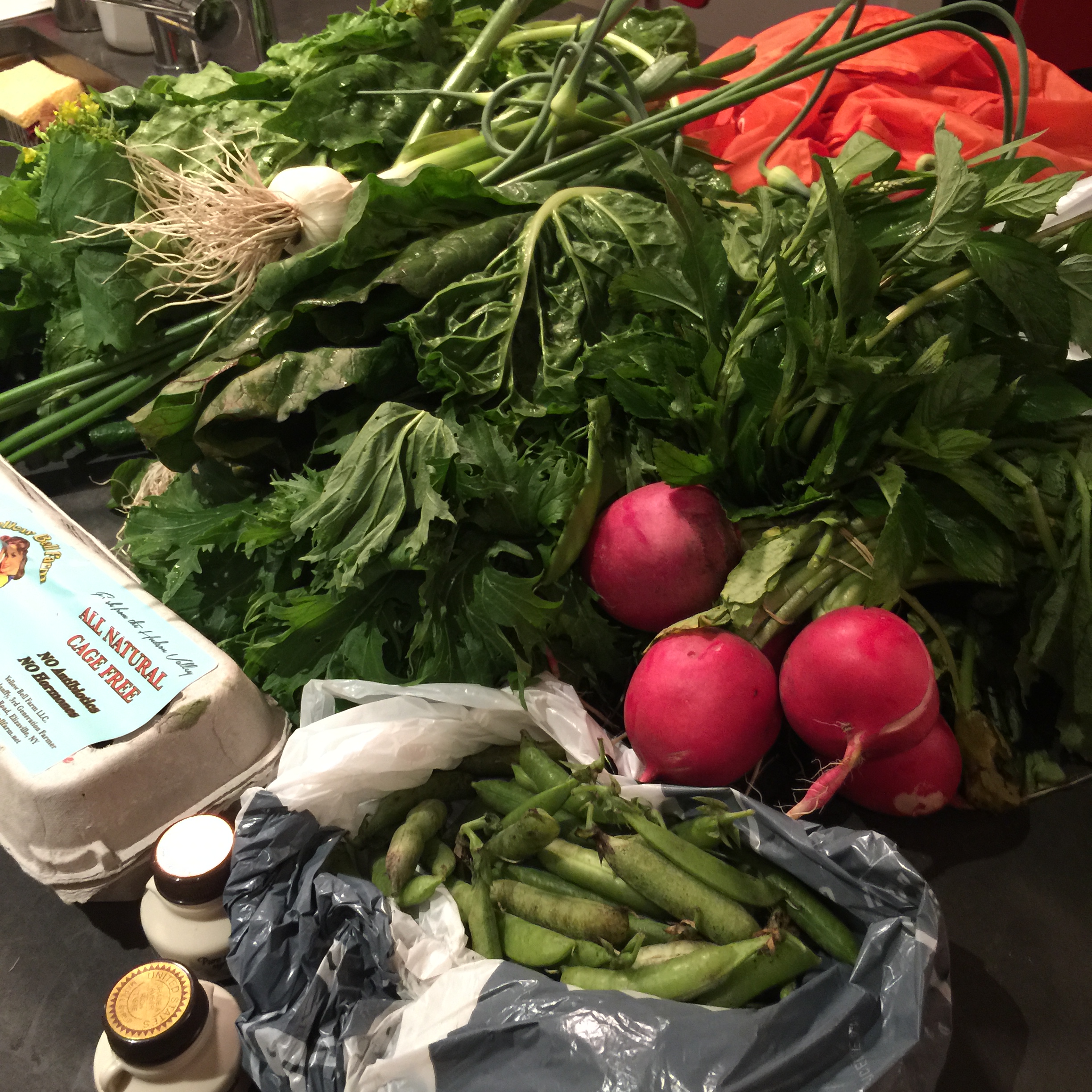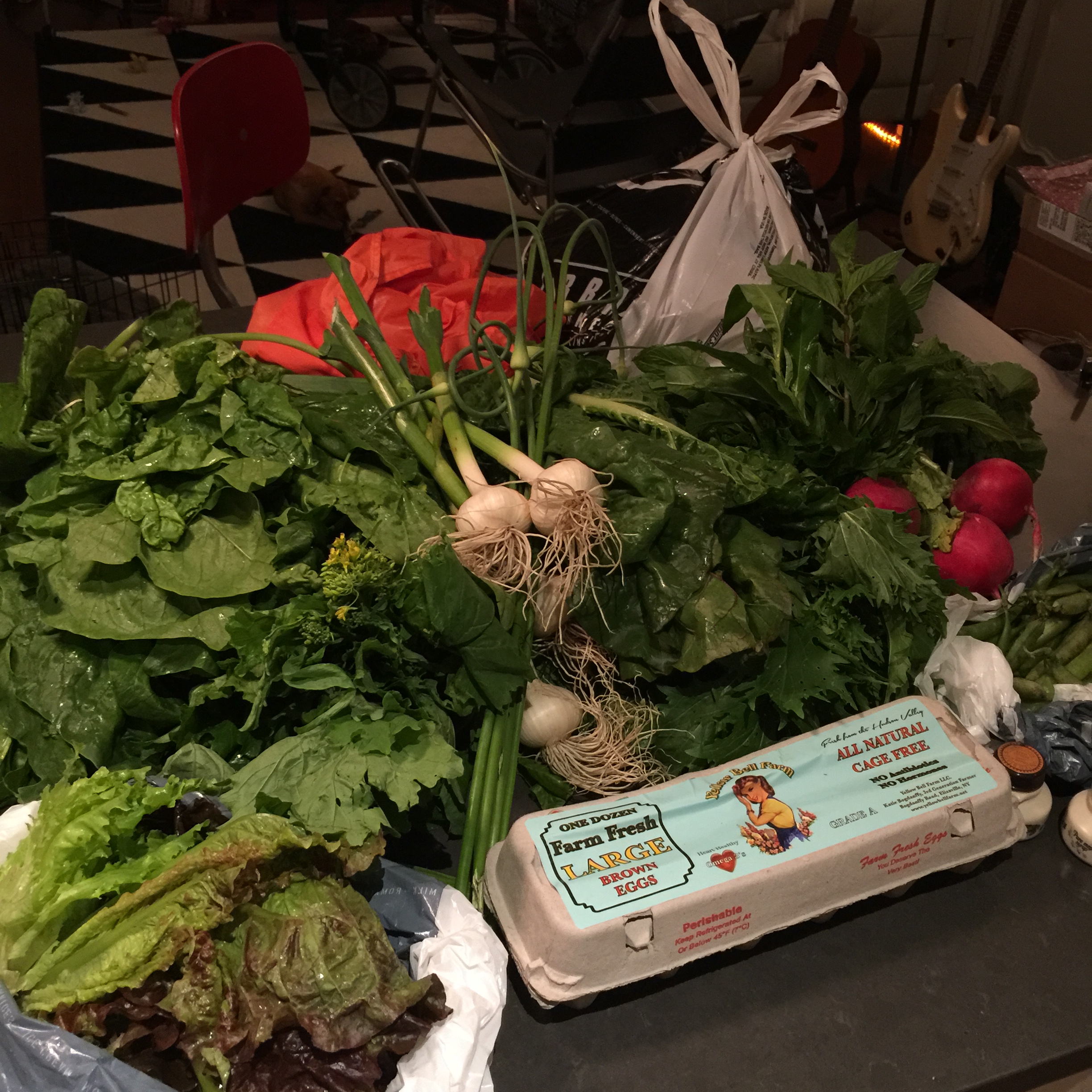 Our schedules are pretty busy and we eat out or order in a *lot* for the sake of convenience, but one of the reasons we do CSA is to slow down and try to cook and eat more together, in the house. I *love* leafy greens, so this weeks share was pretty exciting: spinach, rainbow chard, mizuna, radishes, garlic, garlic scapes, lettuce, snap peas, and broccoli rabe. We also scored some Maple Syrup samples from the [Circle C Maple Farm][] in Pine Bush NY. Thanks guys!