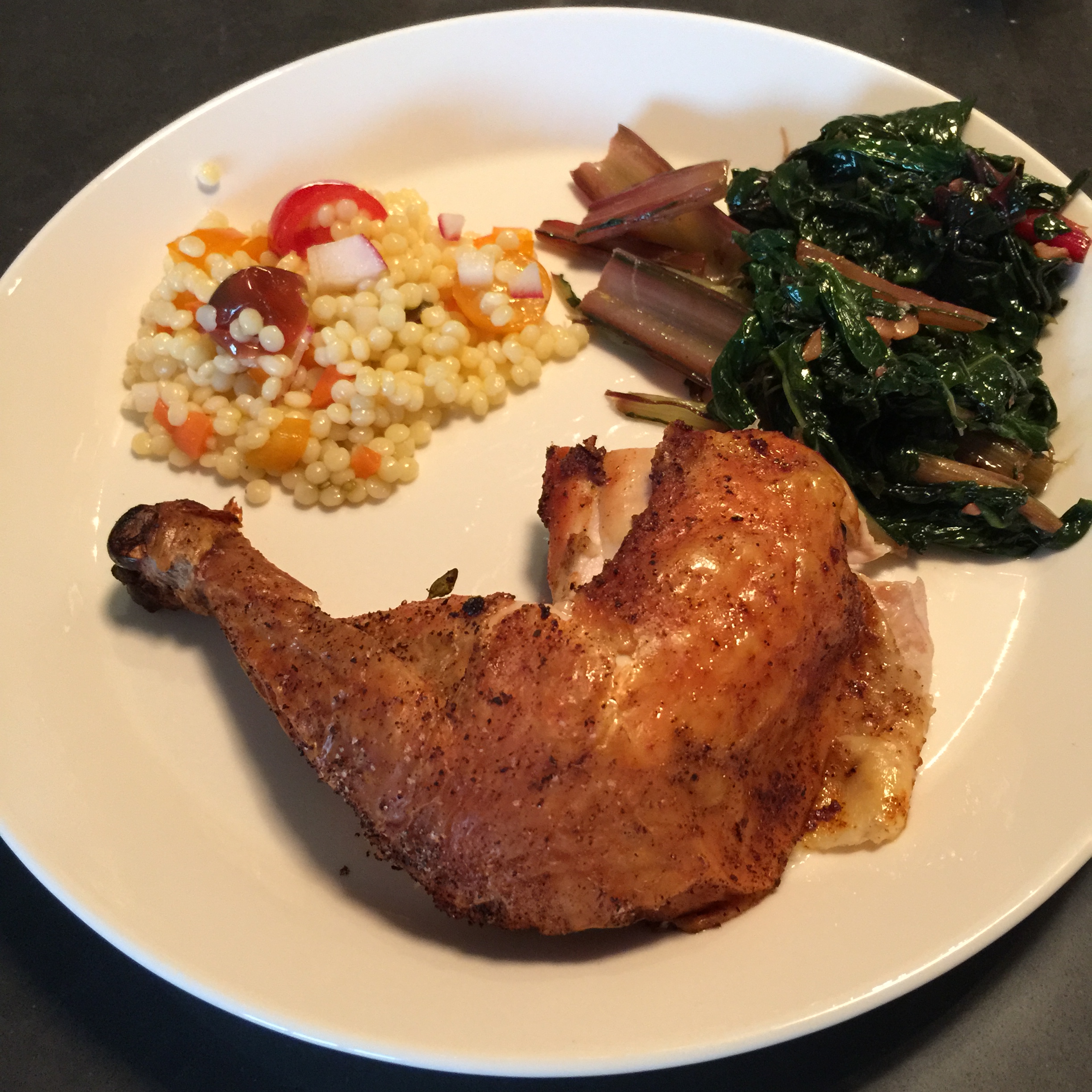 Tuesday night is Chicken night! We made [Keller][]’s Simple Roast Chicken, and I tried a nice [Lemon Garlic Rainbow Chard][] recipe that turned out great.