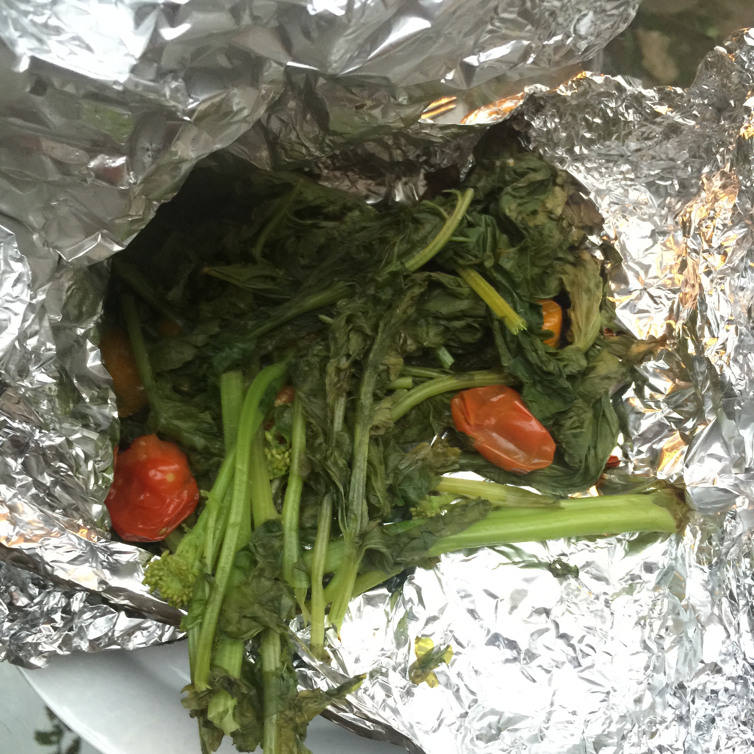 I was hard at work putting the broccoli rabe into foil packets with some over-the-hill tomatoes and a slab of butter. Throw those on the grill for…well, as long as you feel like, really. Be careful not to burn yourself on the steam when you open them up!